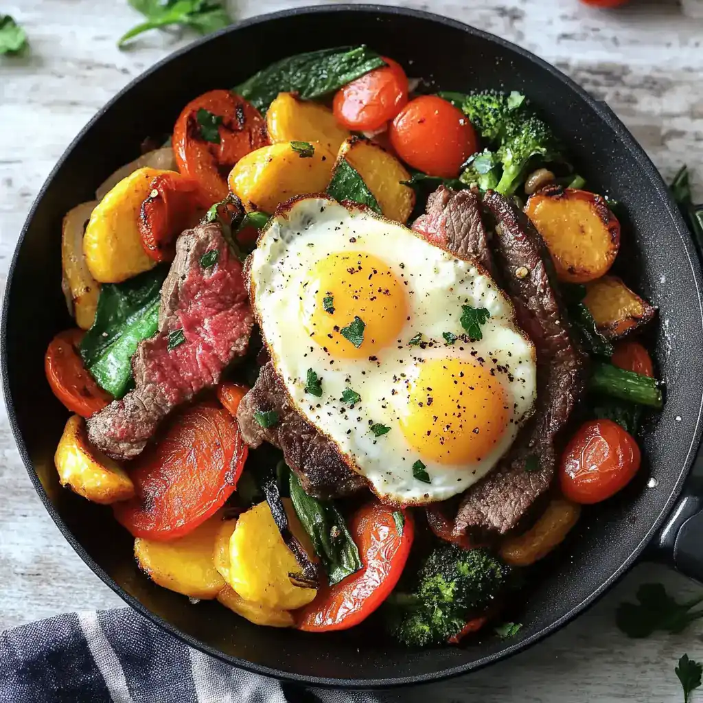 Hearty Vegetable, Steak, and Eggs Skillet