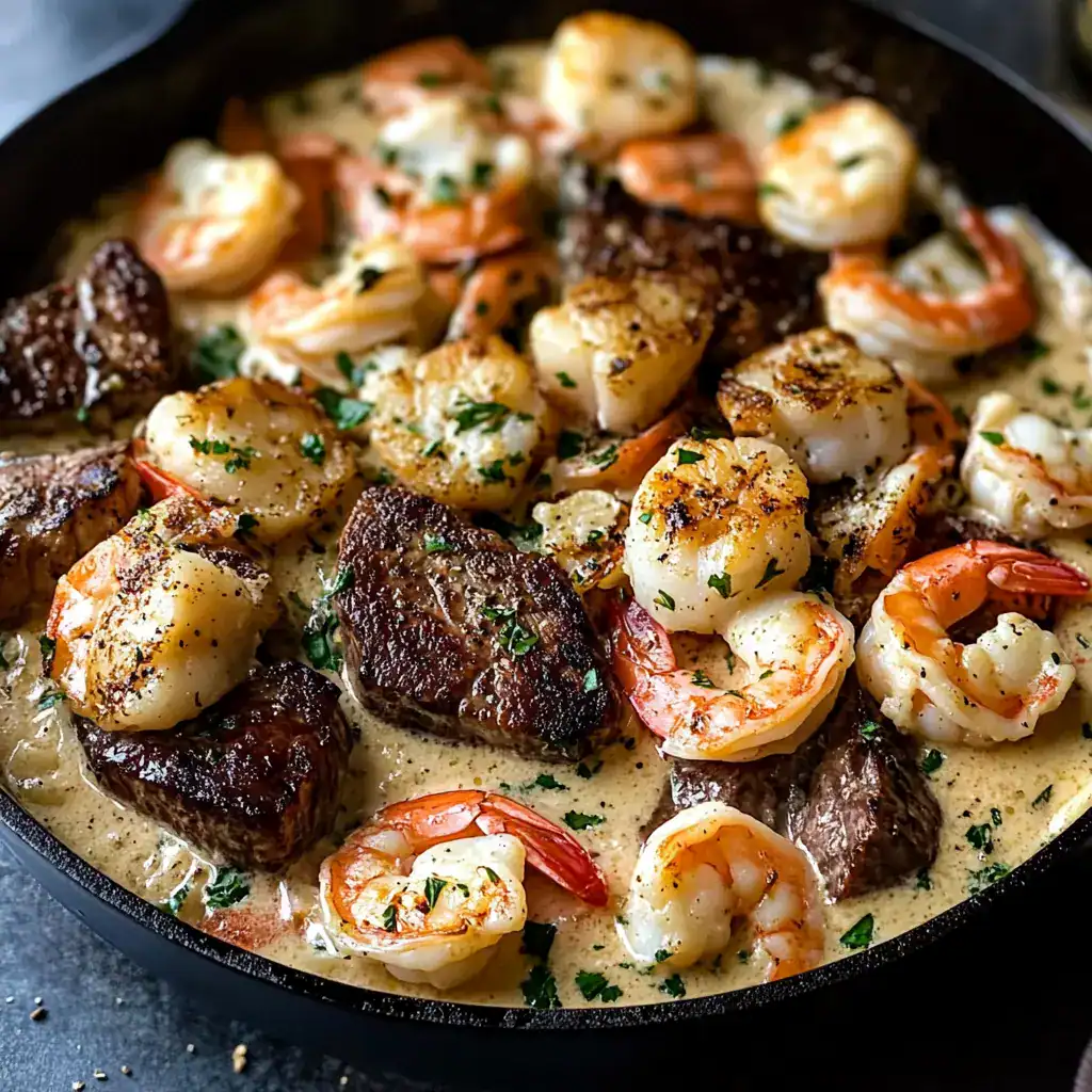 Steak and Seafood Skillet with Garlic Parmesan Cream Sauce