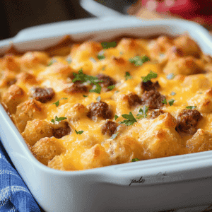 Tater Tot Sausage Breakfast Casserole is a one-pan meal that combines crispy tater tots, seasoned sausage, fluffy eggs, and gooey cheese. It’s simple to make, customizable, and can even be prepared ahead of time for added convenience. The golden tater tots provide a crunchy base, while the eggs and cheese bring a creamy texture that makes every bite irresistible.