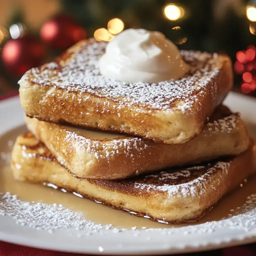 Once all the French toast slices are cooked, serve them warm with your favorite toppings. A drizzle of maple syrup, a dusting of powdered sugar, a dollop of whipped cream, or a sprinkle of extra cinnamon all add the perfect finishing touch to this holiday breakfast delight.
