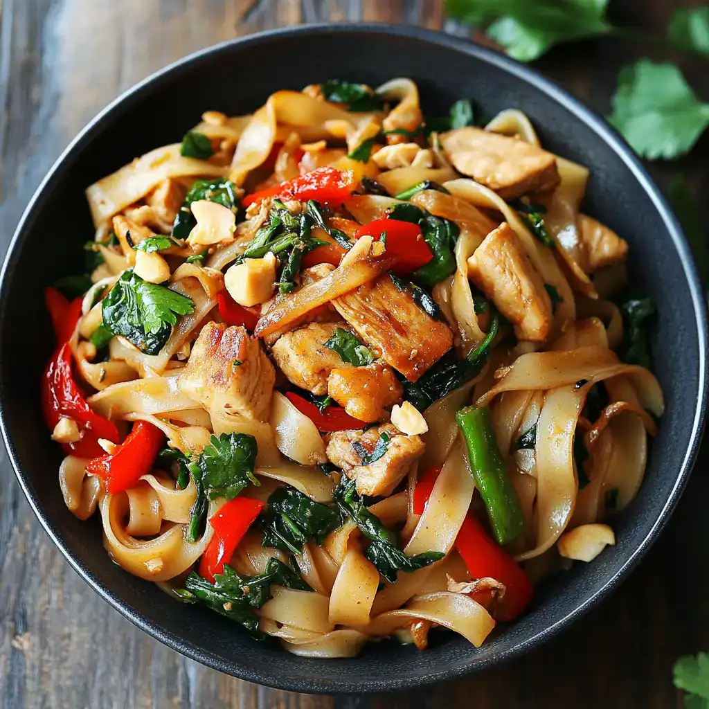 Thai Drunken Noodles, also known as Pad Kee Mao, is a vibrant and aromatic stir-fried dish that showcases wide rice noodles, your choice of protein, and an array of colorful vegetables, all enveloped in a spicy, savory sauce. Despite the intriguing name, this dish does not contain any alcohol. The name is believed to come from the bold flavors that pair wonderfully with drinks, or perhaps from its status as a popular late-night meal after a night out. The real star of this dish is the combination of spicy chilies, savory soy-based sauce, and fresh Thai basil, making it an irresistible choice for anyone seeking a satisfying, flavorful meal.