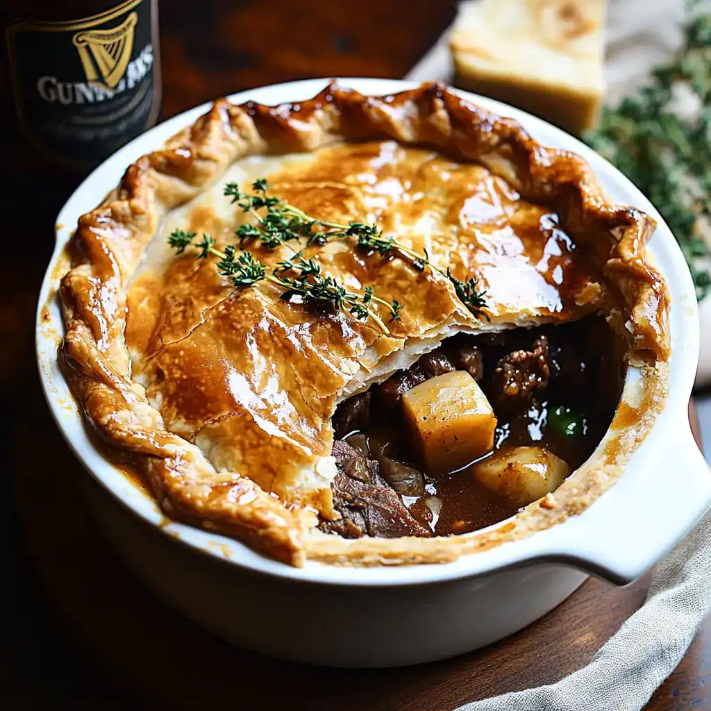 This Guinness Braised Beef Pot Pie is a rich and hearty dish, perfect for cozy nights, special occasions, or whenever you crave a satisfying and comforting homemade meal. The recipe features tender beef slowly braised in a flavorful Guinness stout gravy and topped with a golden, flaky puff pastry crust. It’s a perfect combination of melt-in-your-mouth beef, savory gravy, and buttery pastry—ideal for impressing guests or indulging in a comforting dinner at home.