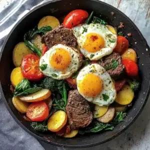 Vegetable, Steak, and Eggs is a delicious, high-protein meal that’s packed with flavor and nutrition. Whether you’re preparing a quick and filling breakfast or a satisfying dinner, this recipe offers flexibility and can be adapted to suit your preferences. With just a few key ingredients and one skillet, you’ll create a balanced dish that delivers a satisfying taste without the hassle. Enjoy the perfect combination of tender steak, fresh vegetables, and eggs, and make this recipe your go-to for any time of day.
