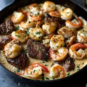 Return the cooked steak and shrimp to the skillet, tossing them gently in the sauce to coat evenly. Let everything heat through for another 2-3 minutes. Garnish with freshly chopped parsley before serving.